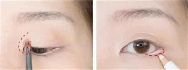 Step4:用棕色眼线笔在下眼睑的内眼角位置画上一小段棕色内眼线。在内眼角的上方也画一小段棕色内眼线。