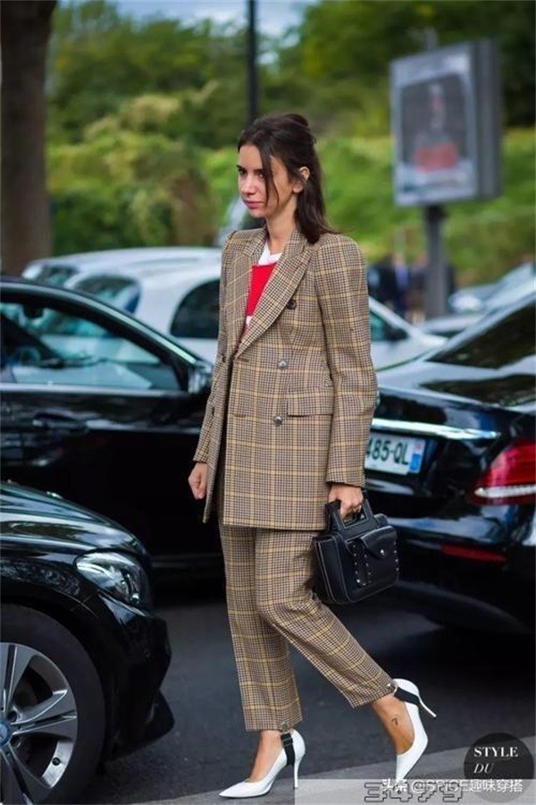 身浅棕色格子西装搭配杏色高领毛衣,浅棕色格子西装套装给人一种复古英伦风的感觉,搭配同色系的杏色毛衣更加温柔,脚上穿一双鲜亮的小白鞋,给整身搭配增添了丝鲜活气息,与传统西裝相比,这身搭配除去了传统西装的低调深沉,给人的感觉更加鲜活明亮,非常减龄。