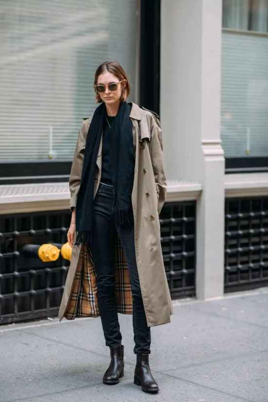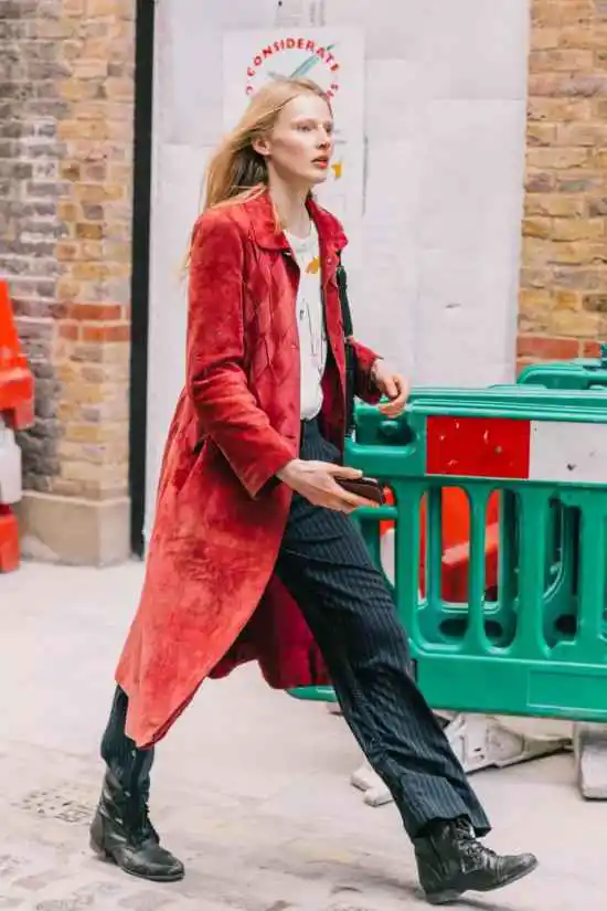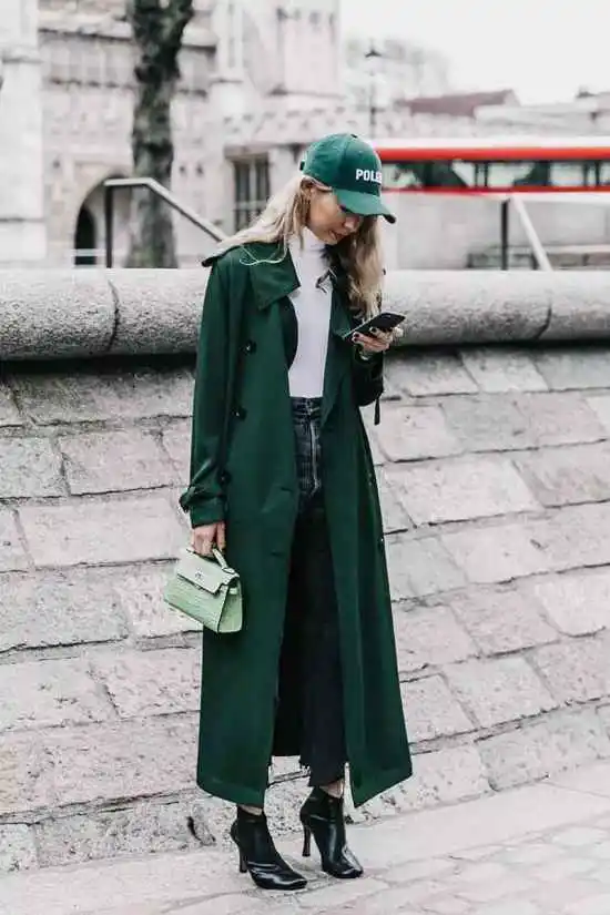 宽松的长款大衣内搭小黑裤,能够形成对比,凸显你的纤瘦。