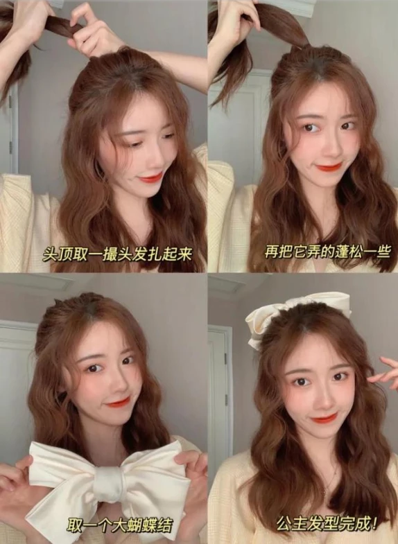 这款公主发的步骤是比较简单的。首先先去头顶的一部分头发把它给扎起来。然后把扎起来的头发给弄的蓬松起来。最后再用一个大大的蝴蝶结,来装饰。美美的公主发就完成了。这款公主发比较适合复古的穿搭,如果你今天是以复古为风格,可以学习公主发。