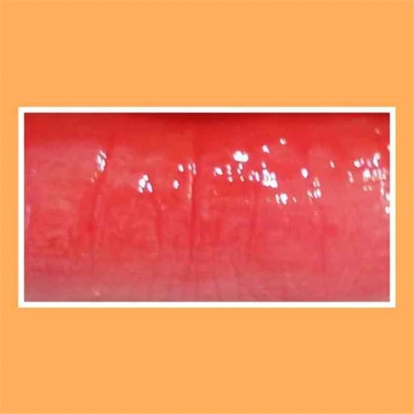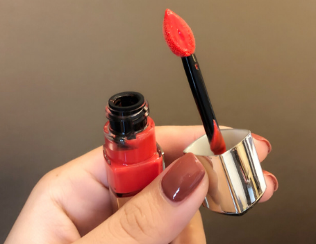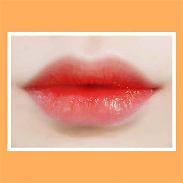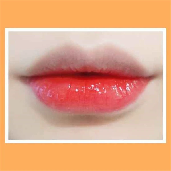 颜色偏橘,薄涂一层的感觉就像润唇膏一样,颜色很浅,非常滋润又有点不明显的橘色感。无论是薄涂厚涂都可构成玻璃唇的效果!
