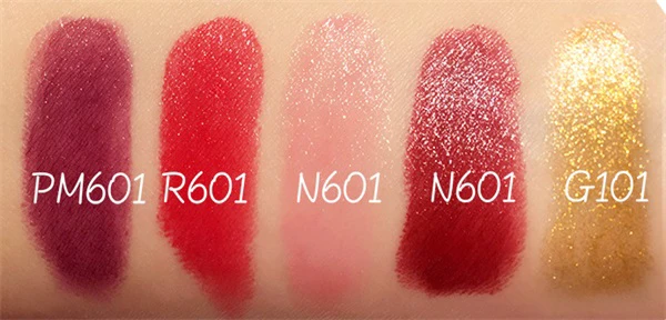 试色拍不出他的偏光和闪,实物我保证美哭你,是一种party queen与生俱来的超级闪!最右金色,比较意外的高显色度,闪光颗粒很高调耀眼,适合和其他唇膏叠加使用,但也要控制用量和力度。