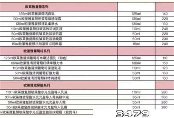 欧莱雅商场专柜价格一般在100-400元之间,价格表图可以参考以下,由于不同系列产品对应的价格存在着差别,有时候可能由于节假日或者是店面搞活动等原因价格会相应的有所波动,建议大家以时候购买时的价格为准。