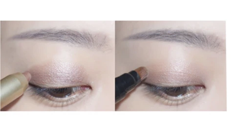 接着将紫棕色眼影笔涂抹在双眼皮范围内加深,然后用自带的刷子晕染自然,注意越靠近眉毛的部分颜色越浅,多次少量慢慢晕染。