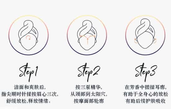 2、接着按三泵,按摩面部轮廓,从颈部到太阳穴,帮助缓解紧张疲惫。