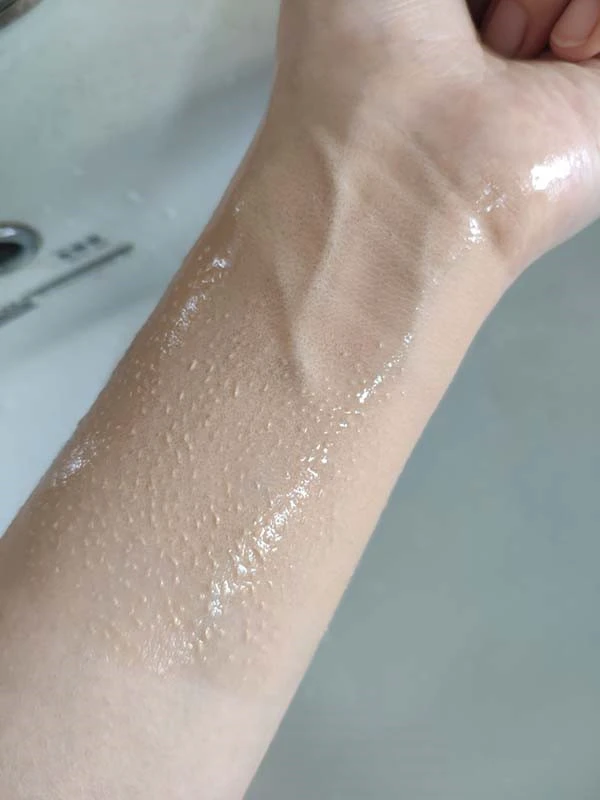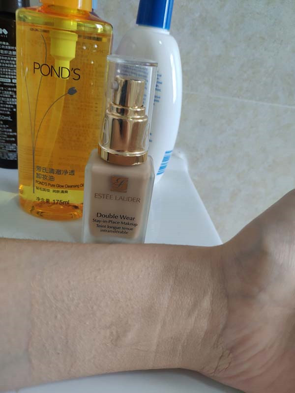 我也试了兰蔻的菁纯粉底液,手臂上涂了雅诗兰黛的double wear粉底,色号1w1,号称夏日油皮最强粉底,很防水,也看到了很多博主推过。对于这款粉底来说,要涂的均匀好看,要快速的推开,不然就会凝固,变成色块了。大致在手臂上涂了一个长方形。