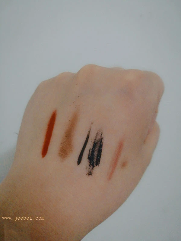 开始使用测试,从左到右依次为口红~眼影~眉笔~睫毛膏~修容。