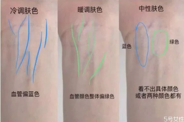 首先我们要先确定自己的皮肤是冷调肤色、暖调肤色还是中性肤色?简单的判断方法是看手腕的血管颜色。如果觉得手腕的肤色和脸差很多,不能确定,那就在参考下图的一些辨别方法。相信你总能感觉的出来自己是偏暖调、冷调还是中性的肤色。若觉得自己是比较中性的肤色,用粉一白或者黄一白都合适,口红脏橘色和梅子色都会显白,眼影会更适合橘色调。这种你情况下如果你买的粉底液颜色尽量看试色的偏白程度来选择,或者是选中性色系的象牙白,自然白之类的。再来看粉底的色号,白皙度可以根据自己用过的粉底液的色号来定义。粉底色号也有不同的深浅明暗,对应不同的皮肤。白皙度1号是最白,2号比1号略深一点,以此类推。比如你试用不同品牌的粉底液,几乎都是黄色调第一白的最合适,那你的肤色就是黄一白无误了,像范冰冰的肤色就是典型的黄一白,黄色调当中最白的肤色。