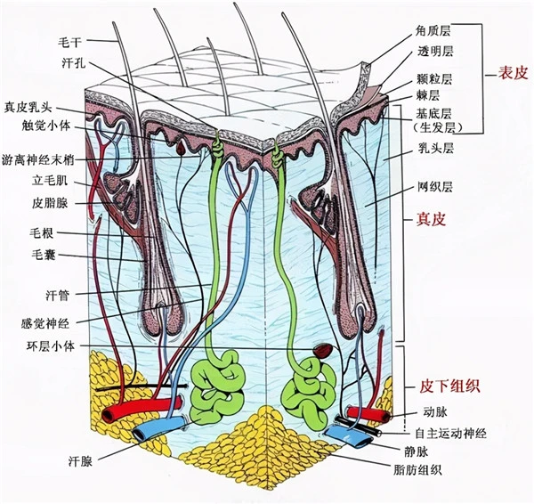 皮肤由表皮、真皮和皮下组织构成,并含有附属器官(汗腺、皮脂腺、指甲、趾甲)以及血管、淋巴管、神经和肌肉等。