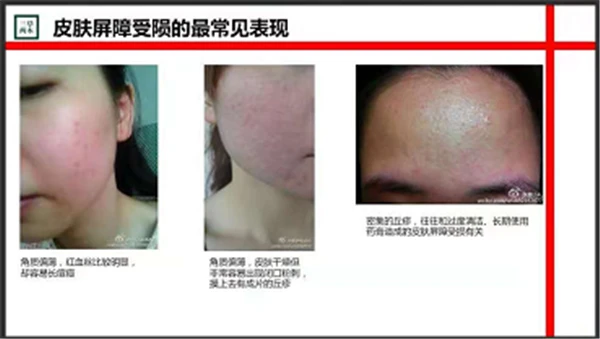 皮脂膜被破坏后的表现。皮脂膜受损,皮肤的抵抗力降低,受冷、受热刺激,会发红、发烫、发痒;容易长闭口粉刺,摸上去有成片的丘疹;角质层偏薄,红血丝明显,容易长痘痘;就是我们说的敏感肌肤。