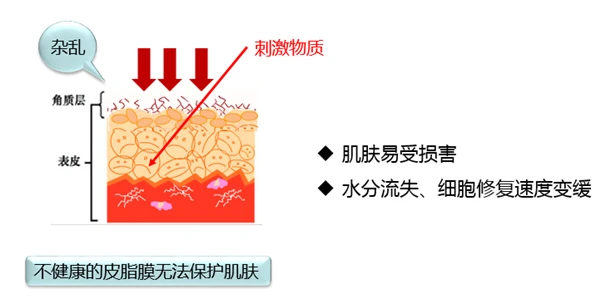 健康肌肤的皮脂膜,分布在角质细胞之间的细胞间隙,每一层都比较整齐,看起来比较健康。不健康的皮脂膜,表现出来就是,细胞排列比较杂乱无章。
