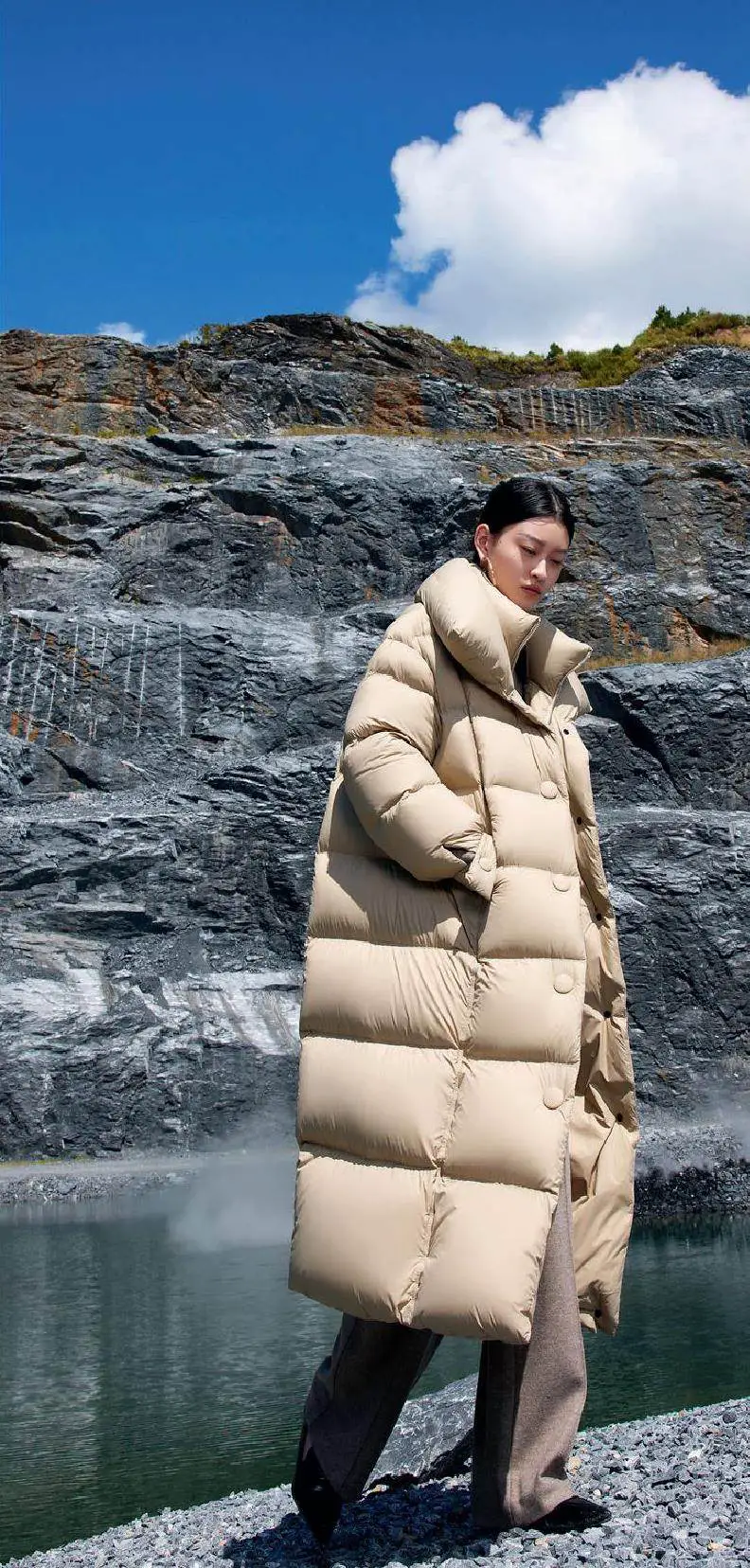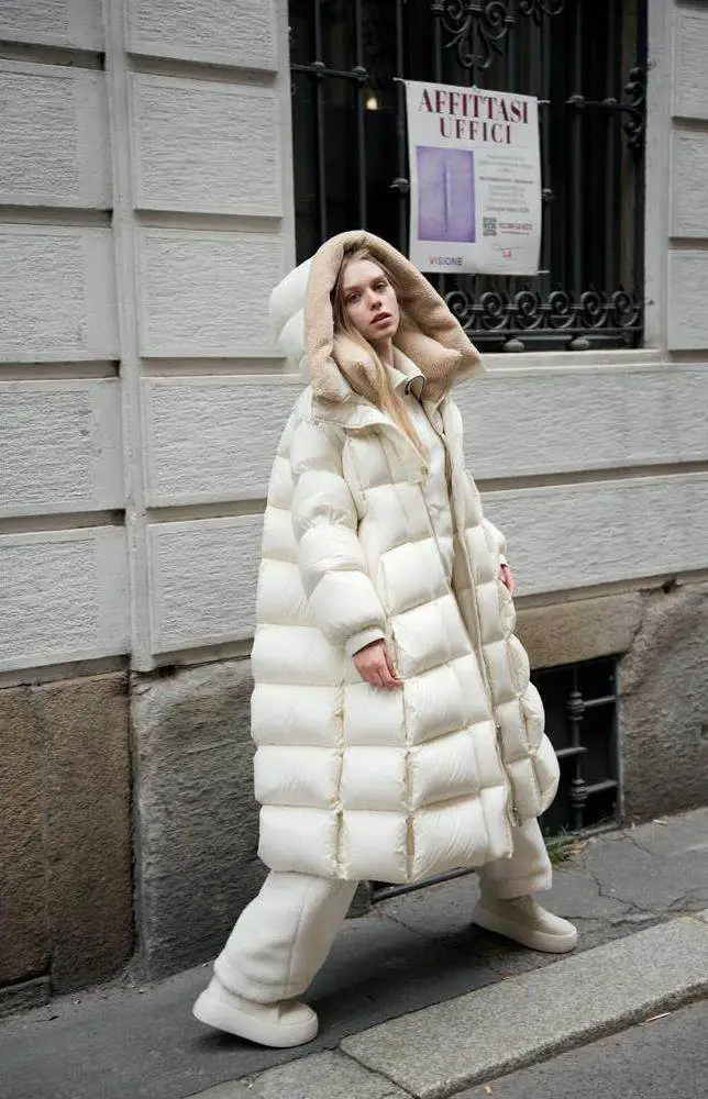 设计以人为本,羽绒服设计更需注重保暖与舒适性。因此,在选材上,品禾服饰讲究采用新科技材料,确保羽绒服既轻盈又保暖;在设计上,注重极简层次与精致细节的融合,让每一件羽绒服都能成为展现个性与品位的佳作。同时,品牌再次突破边界,携手行业顶级技术指导,引入前沿仿生储热科技和生物基尼龙材料,进一步提升羽绒服的性能和舒适度,让消费者在享受时尚的同时,也能感受到科技带来的温暖与关怀。周怡洁说:“仿生储热科技灵感来源于自然界,能够模拟生物体高效的热量储存机制,确保羽绒服在寒冷环境中提供持久且均匀的保暖效果。生物基尼龙材料,则源自可持续植物资源。这种可再生资源不仅减轻了环境负担,更在轻盈与弹性之间找到了完美平衡,显著提升了羽绒服的耐用度与抗风防水性能。拥抱自然,环保先行,这正是我们迈向未来的必然趋势!”而对于羽绒填充物的选择,品禾服饰同样有着严格的考量。“蓬松度700+以上、绒子含量达国标以上的高标准,确保了羽绒服的保暖性能。而Downplus安心绒的选用,更是体现了品牌对可持续性的重视。这种来自RDS认证的羽绒,不仅确保了羽绒来源的无虐待性,还经过了严格清洗和加工,无异味、易清洁,既保暖又环保。”胡敏华说道。