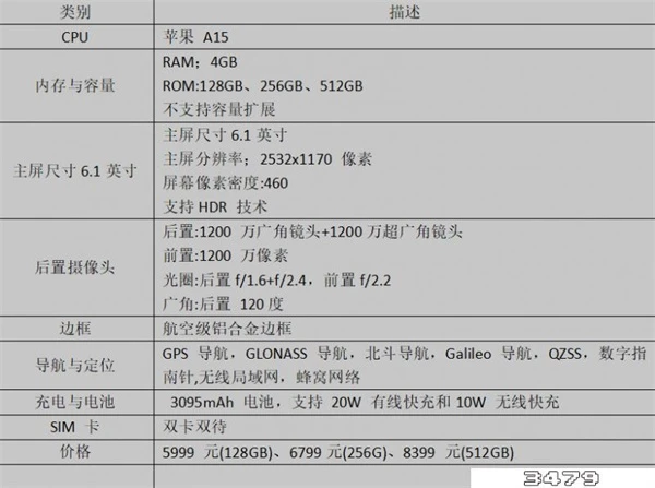 根据苹果13参数配置的详细参数表我们可以知道,苹果13配备了强大的A15仿生芯片,6.1英寸屏幕,后置1200万广角摄像头+1200万超广角摄像头,采用超先进的双摄像系统以及更明亮的超视网膜XDR显示屏。拥有3095mAh电池,可以支持20W有线快充和10W无线快充。利用智能数据切换模式,可以在没有5G的时候切换成4G提高续航。