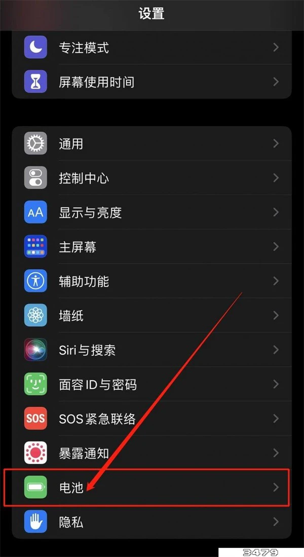 2、进入设置页面后,下滑找到【电池】一项,点击进入;