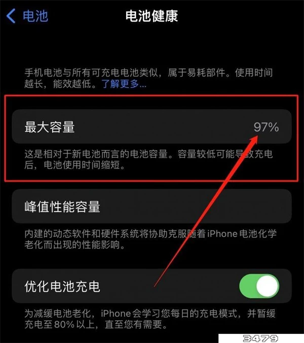4、在电池健康页面即可看到电池的最大容量。