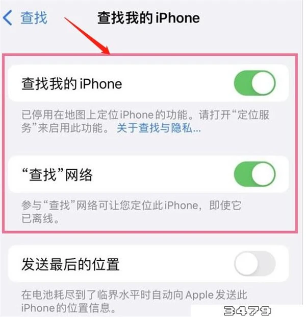 3、进入界面后,打开【查找我的iPhone 】和【查找网络】右侧开关,即可。