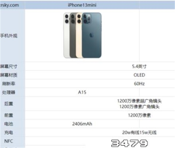 屏幕尺寸:5.4英寸,CPU型号:苹果A15,机身容量:128GB,后置相机:1200+1200万像素,电池类型:锂聚合物电池。