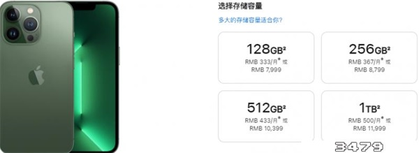 目前苹果13pro在官网的起售价是7999元,共有128GB、256GB、512GB、1TB 4种存储版本。这款手机采用的是6.1英寸的全面屏设计,主屏分辨率为2532x1170像素;总共有银色、蓝色、金色、石墨色和苍岭绿色5种配色可选;支持高刷屏的自适应刷新率;续航能力是非max机型里面最好的。