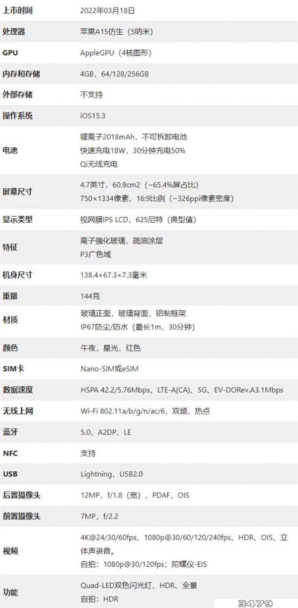 苹果se3是美国苹果公司在2022年3月9日上市的一款智能手机。苹果se3采用航空级铝金属搭配玻璃设计,背面的话则是单摄设计,总共有红色、星光色、午夜色3种配色可选,官网上的价格是3499元(64GB)、3899元(128GB)、4699元(256GB),下面是苹果se3的参数与图片详细配置参数表。