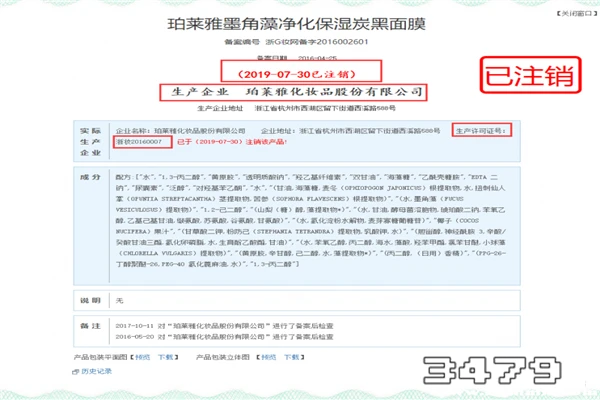 2、不过还是建议慎用购买,从其备案来看,表明这款面膜于2019年7月30日线上已注销状态。如图: