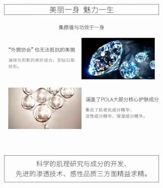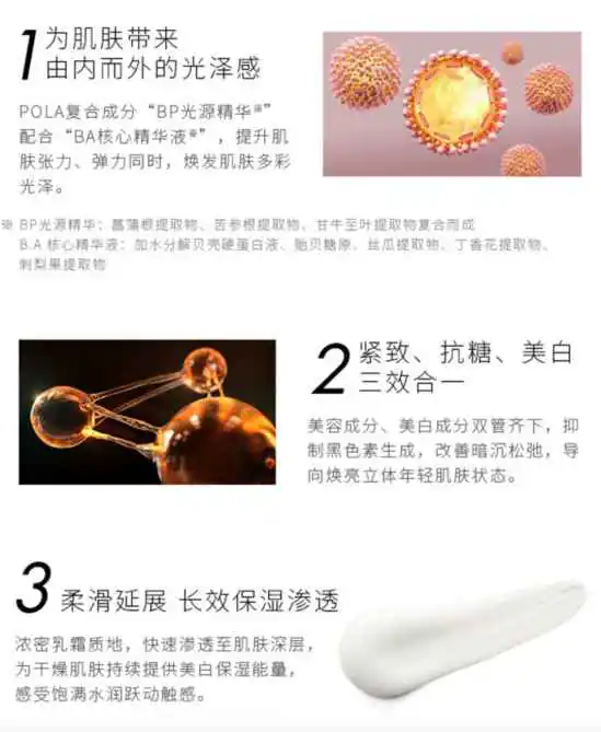 主打功效保湿、提高皮肤弹力、光泽!质地啫喱不粘腻。瓶身非常漂亮,镜面的设计,高端大气上档次!一个月使用下来皮肤肉眼可以看见的嫩白、每天早上感觉毛孔都小了很多,而且水润弹滑,约可以使用3-4个月,真的是非常惊喜,POLA这款精华真心的良心价。