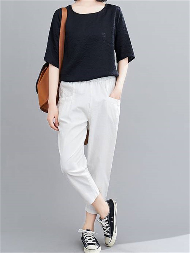 七分白色紧身裤+蝙蝠衫+平底休闲鞋。蝙蝠衫有点宽松,加上紧身的打底裤,正好可以让你的腿看起来特别的瘦,再加上平底鞋的搭配,是不是特别的休闲时尚呢。