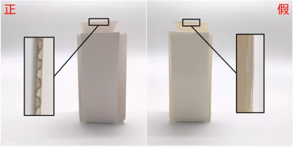 内部的白色底色纸片,正品要比假货更白一些,但是灯光下,是会被影响的,所以这一点是不太能作为辨别点。不过从纸盒边缘可以看出来,正品是呈匀称波浪线的结构,而假货,可能是三层纸直接粘在一起,比较粗糙,没有层次感~