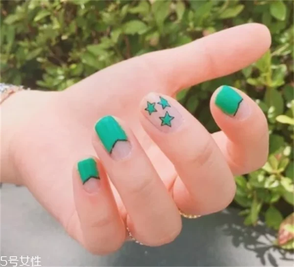 清新绿色美甲在2018年也值得试试看,半涂设计显得有意思,加上小星星设计,超可爱惹人喜欢呢。