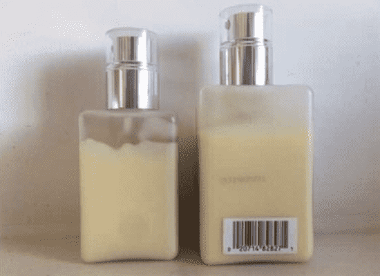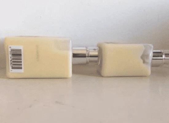 假货的质地较稀比较像乳液,很容易倾倒,而右侧正品更像面霜,流动性不强。