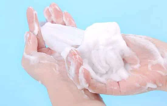 第二步:将适量的千妇恋洗面奶放在手心,加入少许的水,双手摩擦打出丰富的泡泡;