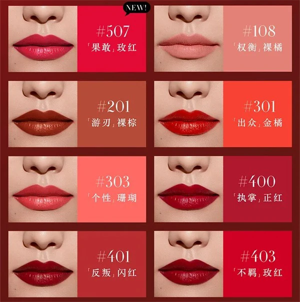 LIP POWER「权力」唇膏系列融合阿玛尼精研技术,推出 4款革新色调。此次全新色号解构原有配方比例,大胆创新传统配方,去除深色唇膏中常用的黑色因子成分,糅合明艳色彩因子,颜色清透加倍,令其更加贴近肤色,轻松打造一抹出色的千面唇妆。