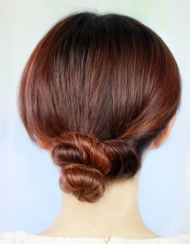 然后将两边的发辫从盘发下方交叉环绕,最后在发根处收尾固定。就酱,一款清爽又优雅的复古盘发就完成了!造型非常的清新温婉。