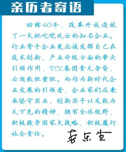 站在改革开放40周年的时间节点上,回首一路的磕磕绊绊,李东生感慨良多:“生在这个伟大的时代,是我们这辈人的幸运,改革开放造就了TCL,也成就了我个人。”
