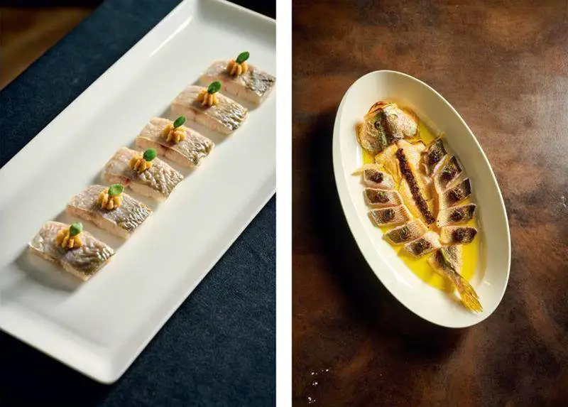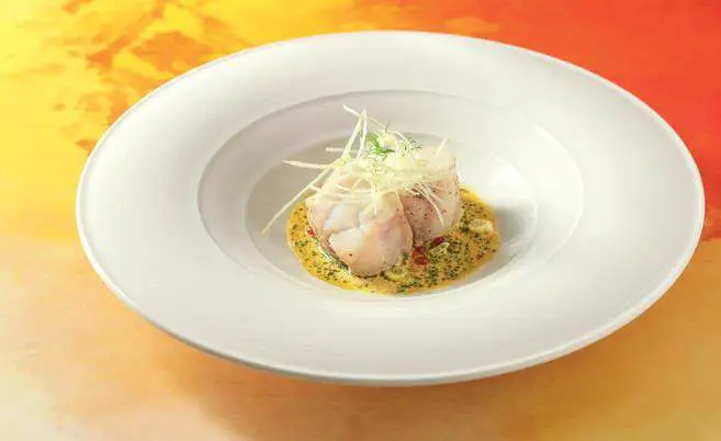 风味十足的香煎安康鱼外皮金黄酥脆,内里鱼肉嫩滑多汁,鲜美无比。搭配的番茄色拉和黑胡椒增添了微酸与微辣,白葡萄酒带来淡淡酒香,最后撒上烤松仁和鲜奶油,口感层次丰富,细腻柔脆,奶香四溢。