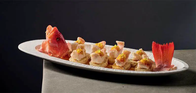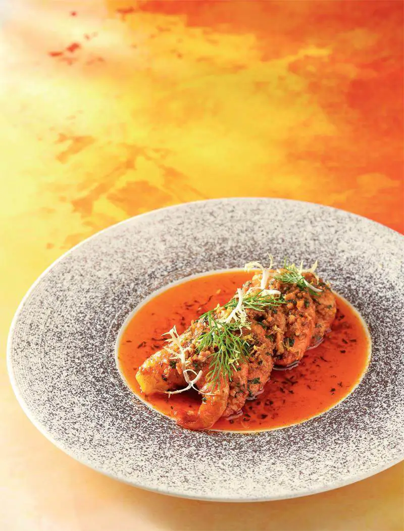 袁振威师傅自制的黄辣椒酱,选用海南新鲜的灯笼椒,其味鲜辣一绝,香气更是勾人食欲。将手工自制豆腐作为垫底,几种食材叠加入口嫩弹鲜香,幻化出美妙的口感,在味蕾中不停绽放。