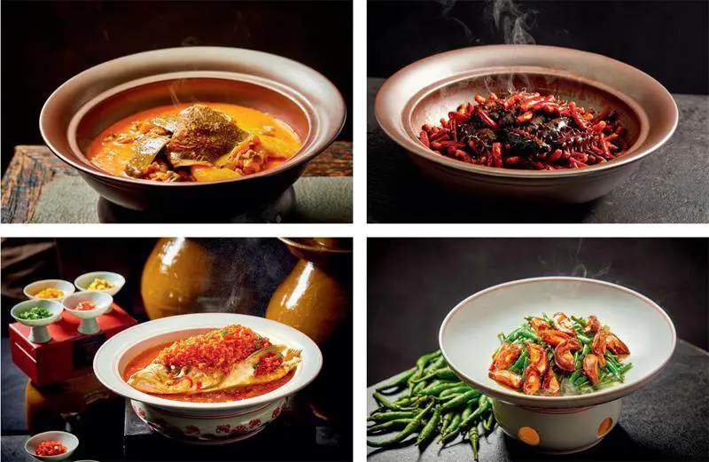 湘菜代表菜以鱼头的“味鲜”和剁椒的“酸辣”为特色。鱼头精选湖南洞庭湖12斤以上的胖头鱼,加入五种不同口味的辣椒,最上一层红亮亮的是牛角红辣椒,用来增鲜;第二层是一年的老坛剁椒,用来增香;第三层是三年的老坛剁椒,离鱼肉最近,用来增酸去腥;第四层是湖南衡阳的三樟黄贡椒,用来增回味;最下一层是野山椒,用来调节辣度,由三湘四水孕育出刀刚火辣的湖南大厨炒制而成。