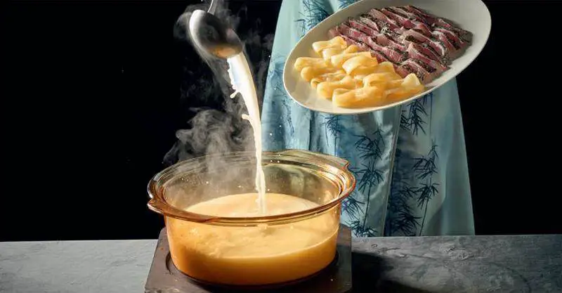 这道菜的灵感来源于袁振威师傅在贵州采风的旅途。柔嫩丰腴的银鳕鱼与酸汤相互平衡后,裹满酸汤的鱼片鲜嫩酸辣,汤汁的独特香气直击味蕾,令人回味无穷。