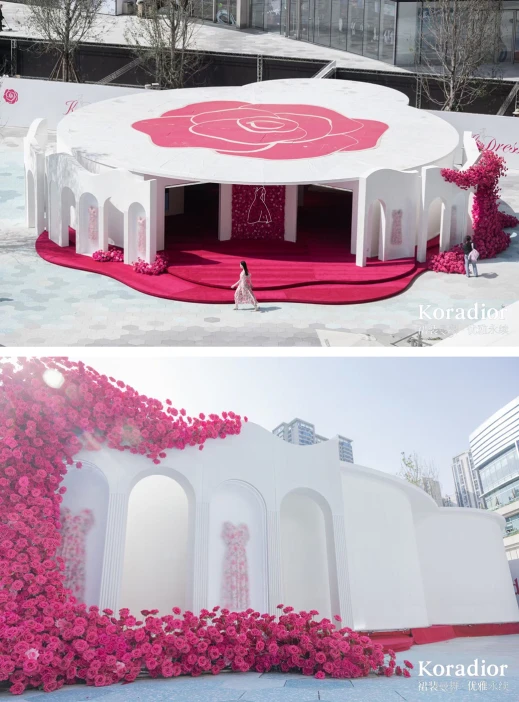 Koradior珂莱蒂尔·裙装季,「裙装曼舞 优雅永续」主题限时店整体空间设计灵感来源品牌标识「玫瑰」,顶部以品牌巨型「线稿玫瑰」为造型,底部蔓延的玫瑰花边以不对称的手法,营造流动的美感。时尚吸睛的品牌玫瑰红,渲染出梦幻般的玫瑰绮景,绽放浪漫魅力。