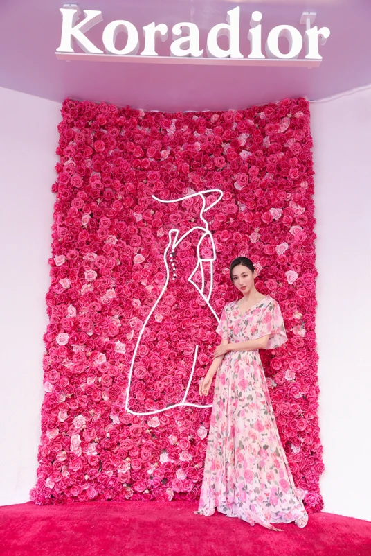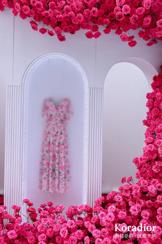 品牌经典连衣裙K dress以独特艺术形态嵌入玫瑰花墙之中,曼妙的裙身曲线与专属的品牌印花透过玻璃若隐若现,给人一种不可触及的美感。