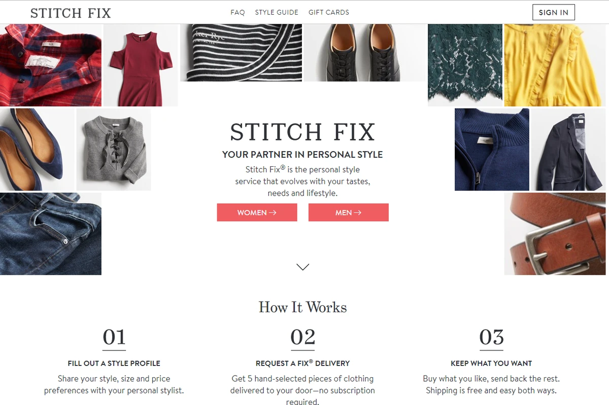 首先,Stitch Fix 会通过其“数据科学+造型师”的方法,根据用户个人偏好和需求推荐五款时尚单品,以按月订购盒子的形式将商品寄送至用户家中;第二步用户在家试穿,留下满意的免费退回不需要的商品。