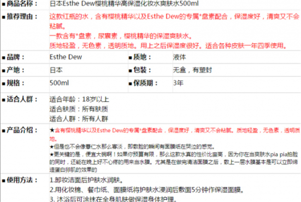 它含有樱桃精华以及Esthe Dew的专属胎盘素配合之地轻盈,无色素,透明质地。用上之后保湿度很好。适合各种皮肤一年四季使用。保湿度好,清爽又不会粘腻。简直是一款便宜大碗的好水