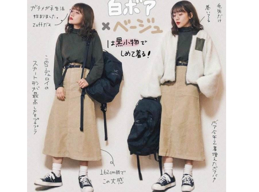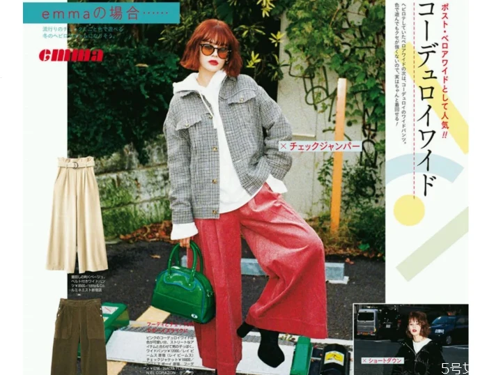还有灯芯绒、丝绒的A字裙、阔腿裤,也是日本妹子的爱,佩服她们总能用一些少女的单品或者配饰,轻轻松松就穿出日系风的俏皮感。