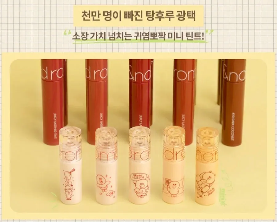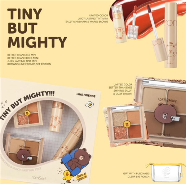 韩国彩妆品牌romand近期携手LINE FRIENDS合作,推出一系列限定彩妆,眼影盘、颊彩、唇彩印上熊大、莎莉人气角色,限量开卖!