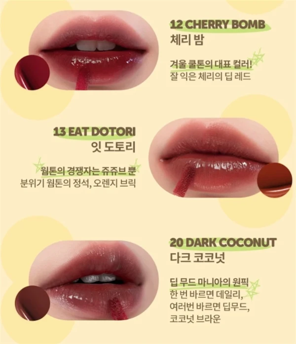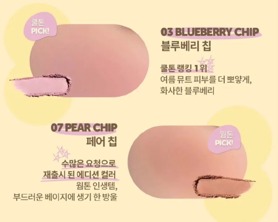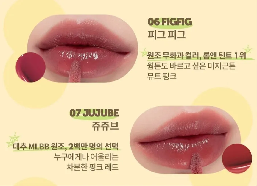 实用度超极高的四色眼影盘也推出了迷你包装款,透明粉盒设计搭配盖子上的莎莉可爱大头,满满的少女心。此次共推出了三个色版,每盘都集结雾面、亮片质地,日常百搭。腮红也推出了迷你版,有两种款式:#03Blueberry chip、#07pear chip,搭配性很高,轻轻一刷,立刻凸显好气色。Romand最有名的果汁唇釉,这回也推出超可爱迷你版!共精选5个色选,水润有光泽,都是非常衬托肤色的颜色。
