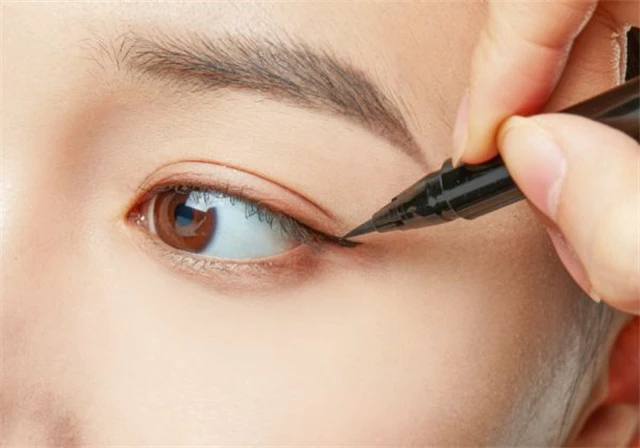 第七步 用黑色眼线笔从眼头开始沿睫毛根部画眼线,眼尾拉长微微上扬。