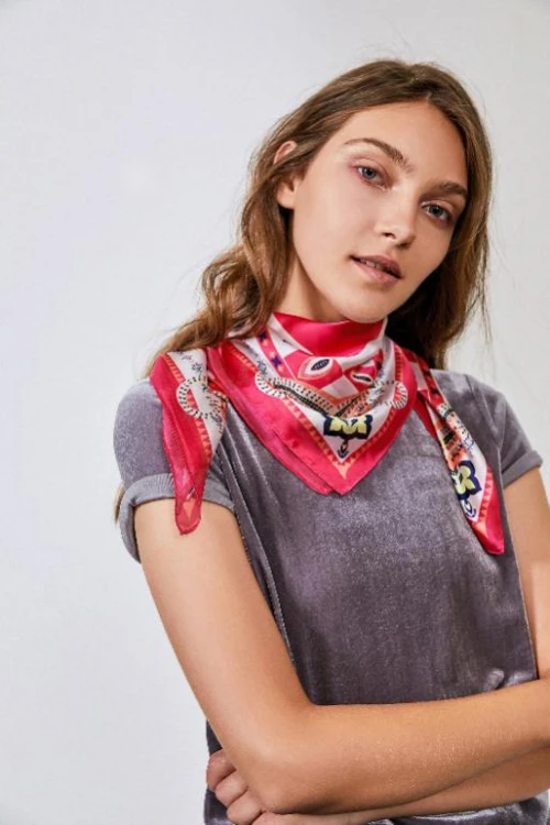 小冰设计的印花丝巾汲取北非摩洛哥文化为灵感,印花图腾演绎神秘印象;醒目色调诠释异域风情,丝巾采用奢感面料,打造柔软亲肤穿着体验。SELECTED此款限量丝巾分别以摩洛哥古城和盛放烟花为故事灵感,静谧似古城;艳丽似烟花,以数字风格相融合,从意象衬托出不同的生命特质。丝巾选以静谧蓝和桃花粉两种悦动颜色作为主色调,以衬托渲染灵感印花的生命力与延伸感,并分别调和以亮橘色系几何图腾,深浅色调对比璀璨耀眼。华丽花边缱绻蜿蜒,罗纹元素缀饰丝巾边框,流畅线条与几何纹样穿梭与中心菱形之中,以辐射状果敢发散,精致繁华细节构筑整体画面。SELECTED x 微软小冰印花丝巾灵感涌动,色调果敢醒目且图腾精致繁复,几何元素赋予整体设计新生命,独具的匠心体现在每一段织线中,浪漫飘逸面料陪伴都会丽人邂逅仲夏乐章。