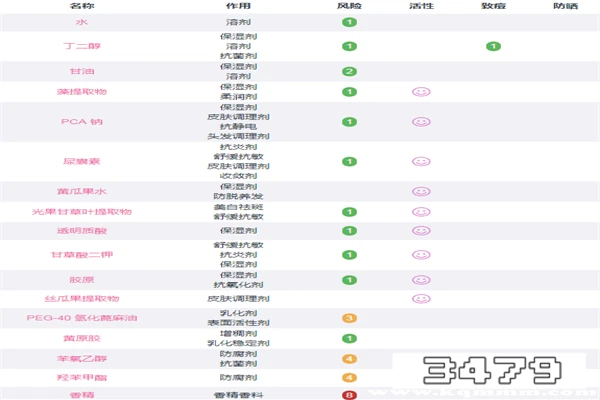 从以上成分表中可以看出,主要的有效成分有8种,分别是胶原、神经酰胺 2、氢化淀粉水解物、糖基海藻糖、黄瓜果提取物、透明质酸钠、丁二醇、光果甘草根提取物。防腐剂有两种,分别是苯氧乙醇、羟苯甲酯。这款面膜不含有酒精,安全系数还是比较高的,但含有香精,所以敏感肌使用的时候要慎重,最好先测试下。