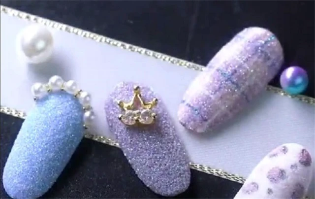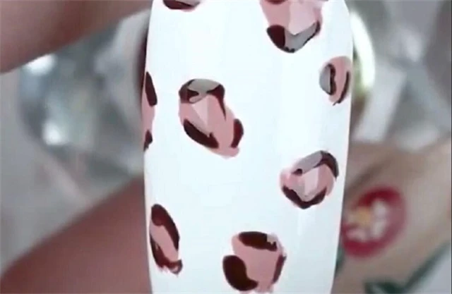 先涂上底油,再给指甲涂上白色甲油;用彩绘笔蘸取粉色和咖色甲油画出斑点并涂上封层;在甲面上倒上砂糖粉并轻轻抖动甲面使其均匀分布,再用刷子扫去多样的余粉,涂上封层照灯处理即可。