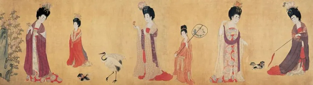 原画中描写了六位衣着艳丽的贵族妇女及其侍女于春夏之交赏花游园的场景。