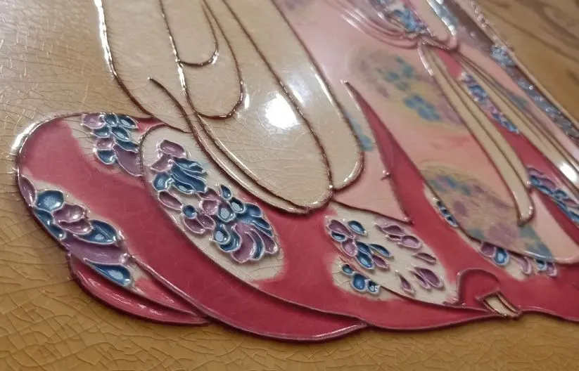 这两件仕女壁画,不同于纸上作画,因其在陶板上呈现画面,故称陶板画,因此它也具有了独特的凹凸纹理感,大家可以亲身来到艺术馆近距离观察它的纹路。